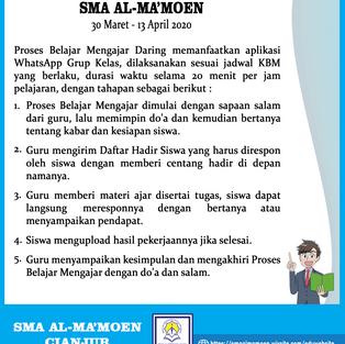 Salah satu metode sederhana dalam pebelajaran daring yaitu memanfaatkan media yang sehari-hari digunakan siswa yaitu whatsapp, akan tetapi guru bisa mengembangkan atau menambah media daring lainnya ketika proses belajar daring dilaksanakan, karena disaat seperti inilah kreativitas seorang guru diuji agar siswa dan seluruh warga sekolah aman diruman masing-masing dan pembelajaran masih bisa berlangsung dengan baik dan tidak memberatkan siswa. Walaupun Belajar Daring Mandiri dirumah masing-masing, diharapkan siswa SMA Al-Ma'moen selalu mengawali pembelajaran daring dengan berdoa terlebih dahulu dan diakhiri dengan do'a, dan tetap melaksankan pembiasaan yang biasa dilakukan di sekolah, seperti tadarus, shalat dhuha dan juga shalat lima waktu tepat waktu